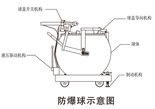 球型防爆球的球體和球蓋采用了球蓋內置式結構,當球蓋關閉時與球體在整個圓周圍上緊密閉合在一起,形成一個完整的球體。具有極強的抗爆能力。開關結構采用液壓驅動,使用簡單便捷。