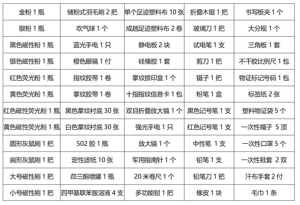 此箱屬于加強型配置,是該系列產品中配置最為齊全的勘查箱。不僅具有多種指紋、足跡及其它痕跡的提取方法,而且還配有豐富的通用工具,用于測量、繪圖及拆卸承痕體等。